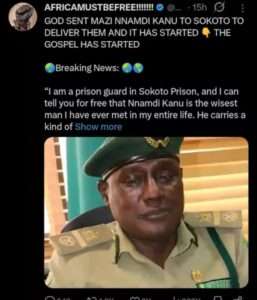 “I am a prison guard in Sokoto Prison, and I can tell you for free that Nnamdi Kanu is the wisest man I have ever met in my entire life. He carries a kind of wisdom that feels divine — the wisdom of Allah Himself, and he does not deserve to be here,” the warder reportedly said.