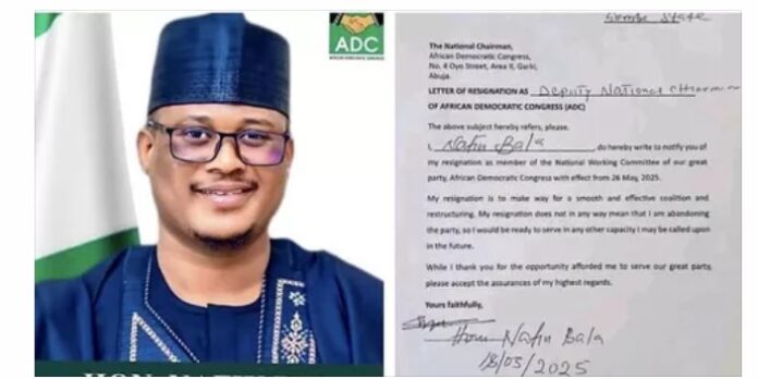 The internal turmoil rocking the African Democratic Congress (ADC) has taken a dramatic turn following the emergence of a resignation letter allegedly authored by Nafiu Bala, further muddying the already troubled waters of the party’s leadership crisis.