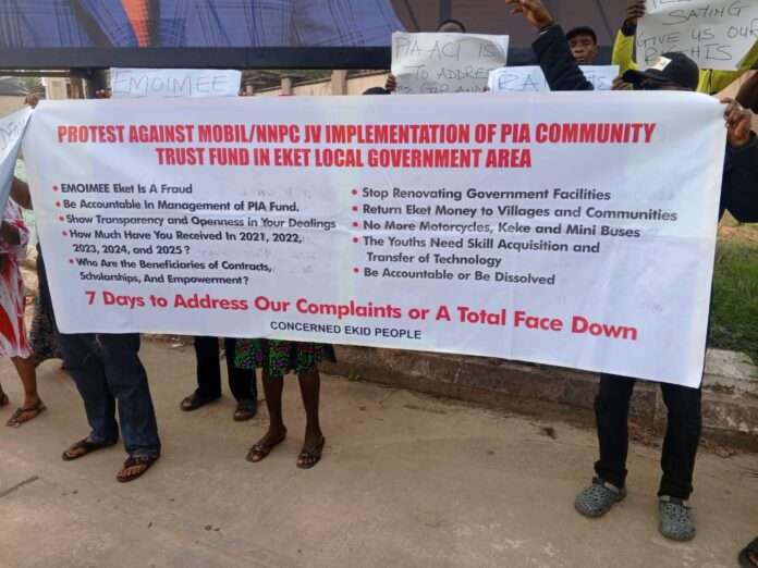 Pressing home their reservations in a peaceful protest at the EMOIMEE office in Eket, the protesters drawn from all the communities in Eket called for a probe of the Trust.