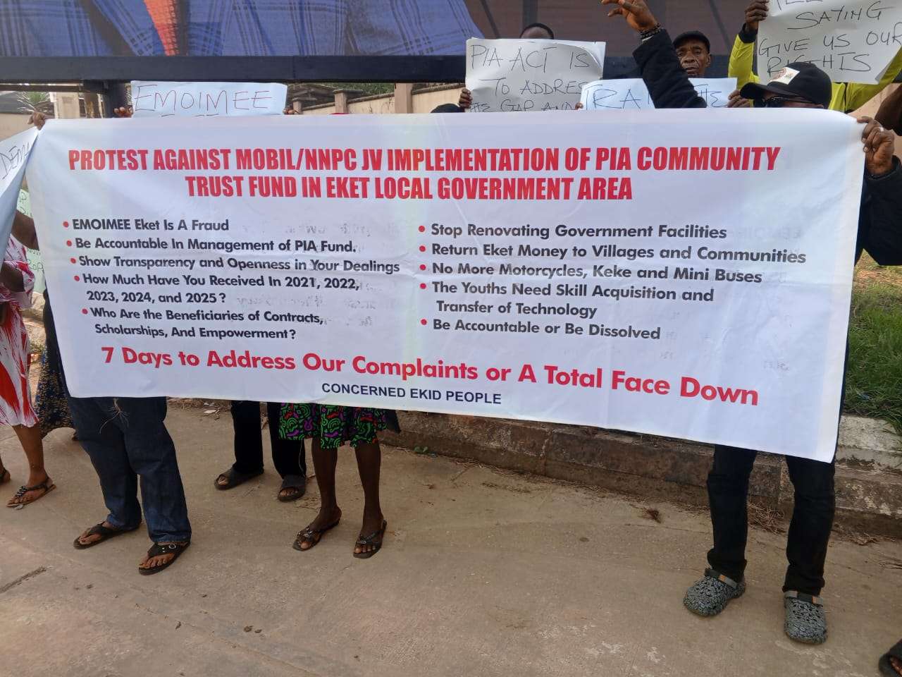 Some of the placards displayed read; “EMOIMEE Eket is a fraud, “Carry our Village Heads along”, “Mobil/NNPC JV should probe EMOIMEE Eket, “Who are the beneficiaries of Contracts, Scholarships and Empowerment”, “Dismantle the cabals”, “We need accountability and Transparency”.