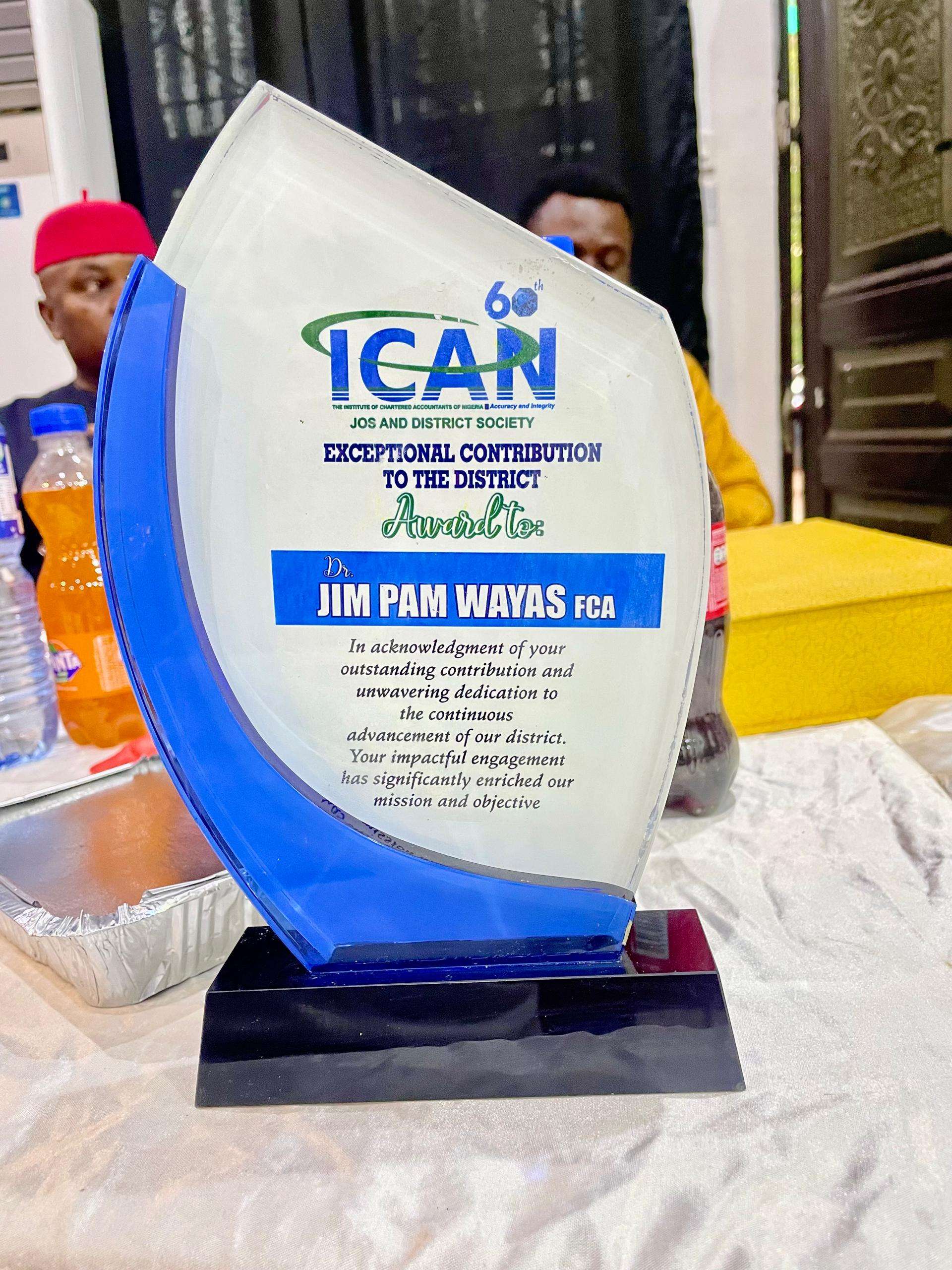 The Jos and District Society of the Institute of Chartered Accountants of Nigeria (ICAN) has honoured the Executive Chairman of the Plateau State Internal Revenue Service (PSIRS), Dr. Jim Pam Wayas, PhD, FCA, for his outstanding contributions to the growth of the accounting profession and institutional development in Plateau State.